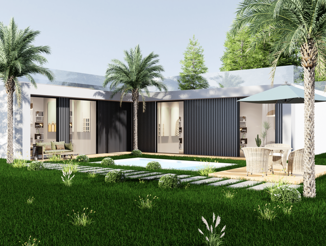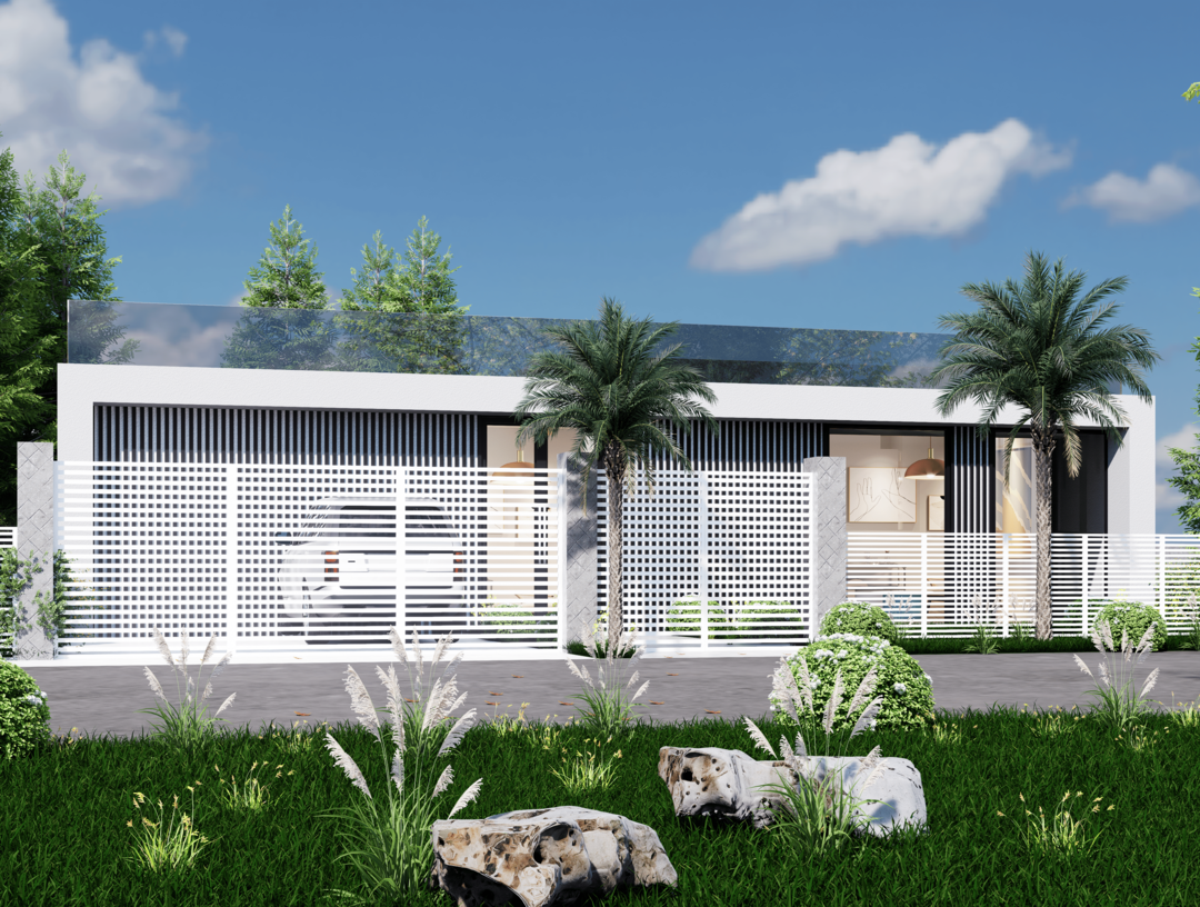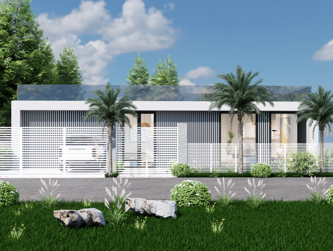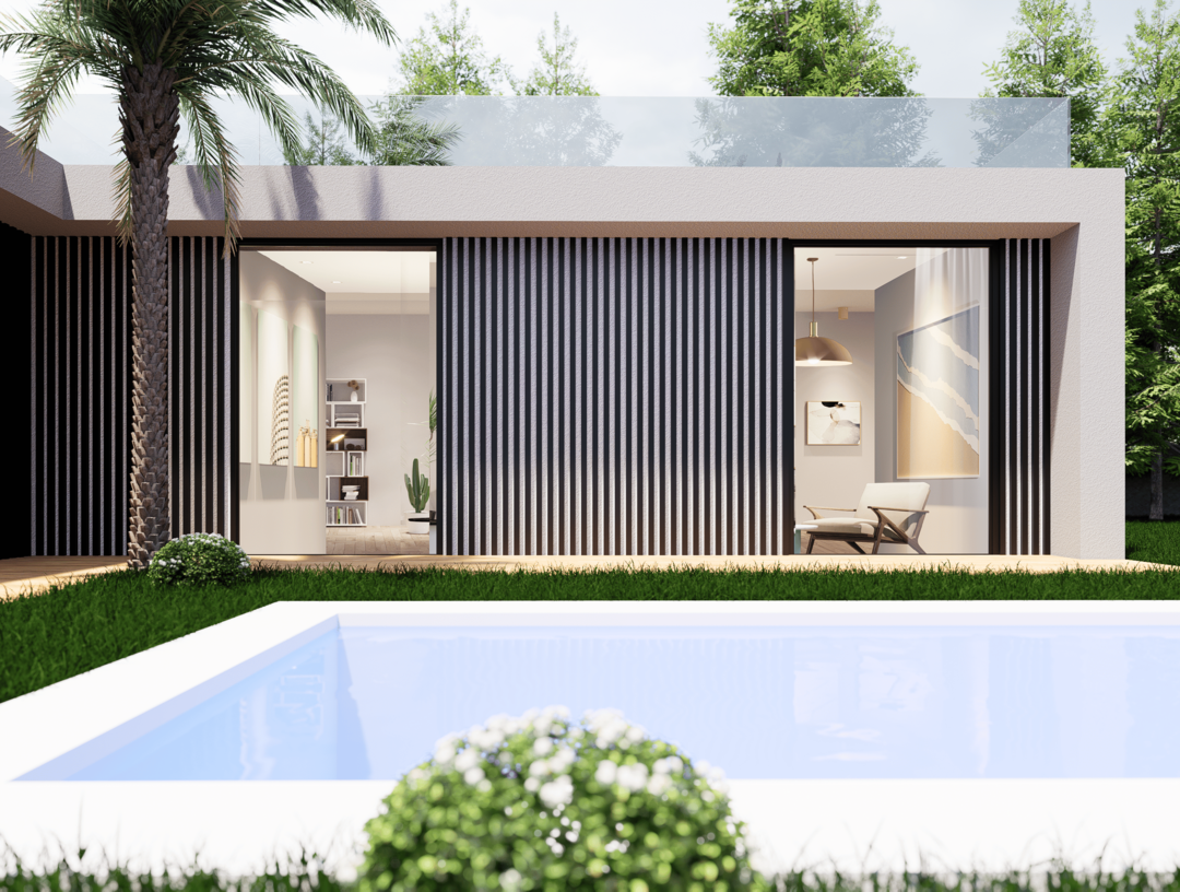 The villa’s geometric design and horizontal lines define a minimalist, modular aesthetic. Large windows open to the garden and pool, ensuring a fluid transition between indoor and outdoor spaces. The house can be configured as a family residence or holiday home, with a focus on simplicity, efficiency, and modern Mediterranean lifestyle.